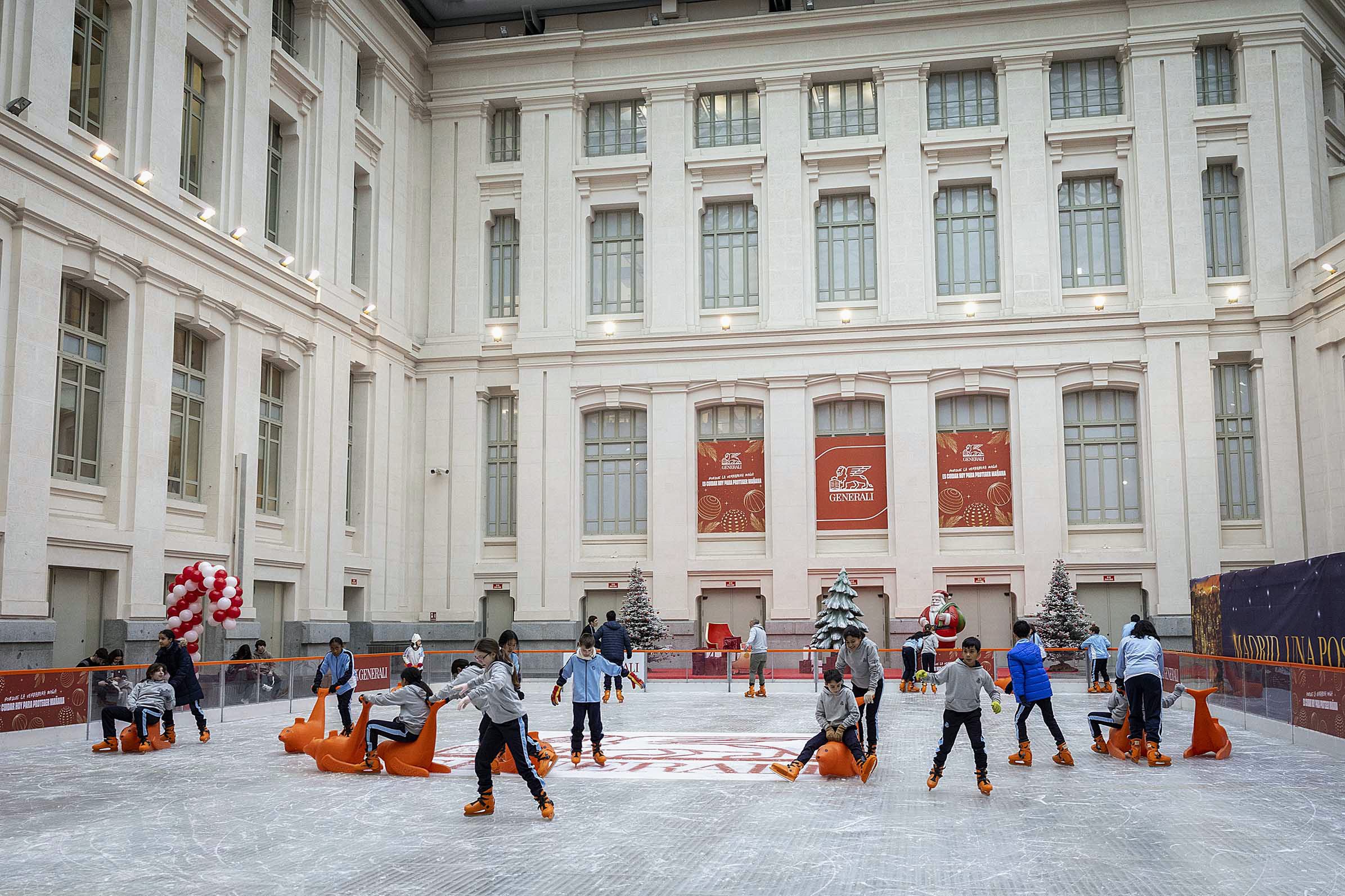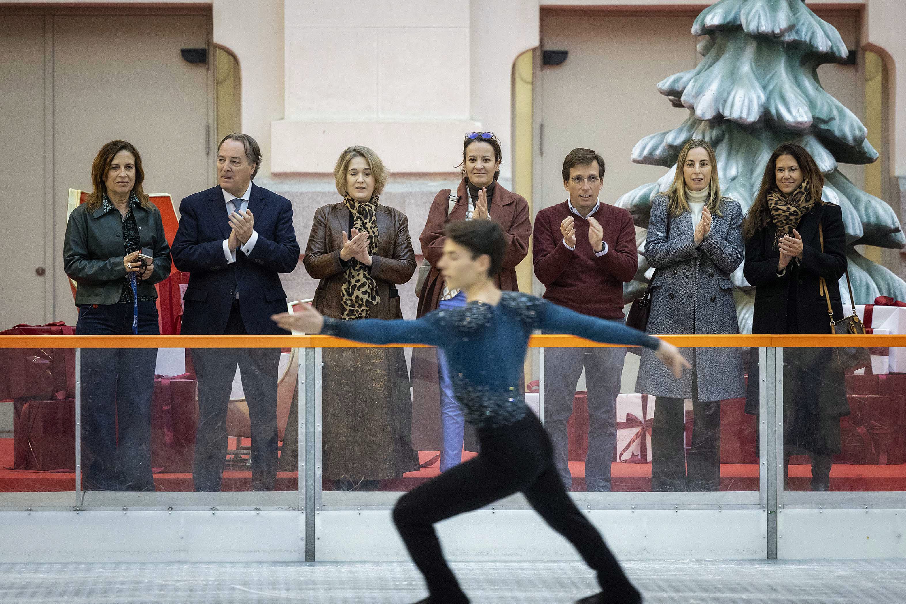 El alcalde de Madrid, José Luis Martínez-Almeida, acompañado por la delegada de Cultura, Turismo y Deporte, Marta Rivera de la Cruz, ha inaugurado la tradicional pista de hielo que el Ayuntamiento instala cada año en la Galería de Cristal del Palacio de Cibeles como parte de la programación navideña municipal.